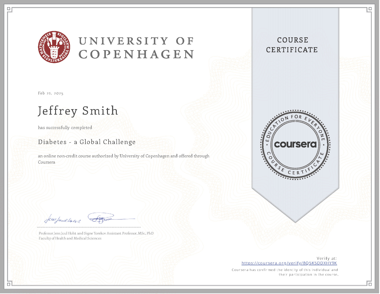 I’m pleased to share that I’ve successfully completed Diabetes – A Global Challenge, an online course authorized by the University of Copenhagen and offered through Coursera. The content goes well beyond the basics, covering genetic factors, inflammatory processes, stem cell-based therapies, and the development of antidiabetic agents.