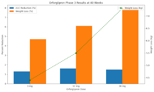 Eli Lilly’s once-daily oral GLP-1 candidate, orforglipron, has achieved statistically significant results in its first phase 3 trial, positioning the company as a front-runner in the oral GLP-1 space. The trial showed A1C reductions of up to 1.6% and weight loss of up to 16 pounds (7.9%) over 40 weeks, with a safety profile consistent with injectable GLP-1 drugs like Ozempic. Lilly plans to seek approval for obesity later this year, followed by a type 2 diabetes submission in 2026.